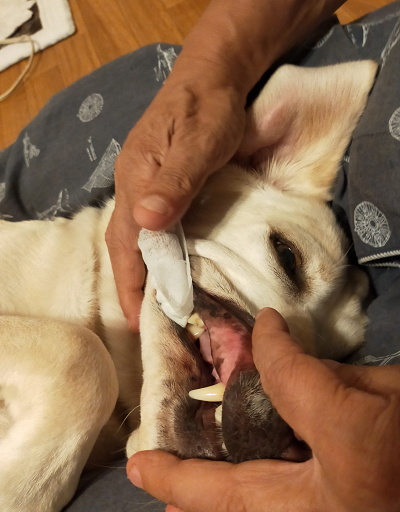 イエローラブなのに黒い毛を発見!おばあちゃんからのプレゼントなのかな?